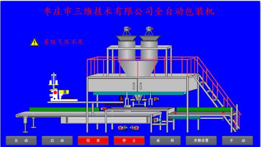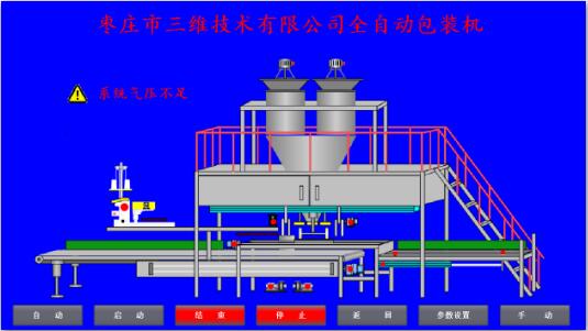 如出現圖中報警信息時,在處理完報警內容并且沒有報警信息后,點擊“自動”按鈕,或外部旋鈕選擇,此時“自動”按鈕顯示為亮綠色,提示切換完成,按儀表啟動按鈕,啟動稱料系統(tǒng),點擊屏幕或外部“啟動”按鈕,設備啟動時首先經過6秒左右的初始化,報警燈伴隨聲光報警,提示相關人員設備啟動,套袋擺臂執(zhí)行一個抬起落下動作,以回到準備位置,抱袋小車如不在準備位置則回到準備位置。初始化完成后,屏幕上啟動按鈕亮起,設備進入正常工作狀態(tài)。