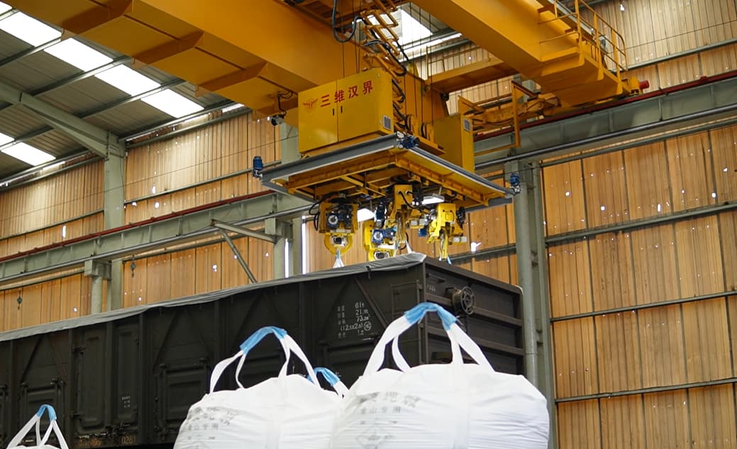 - 機械執(zhí)行:輸送機將噸袋送至抓取工位,吊裝系統(tǒng)按預設(shè)程序精準抓取并碼放至車廂指定位置,叉齒設(shè)計可保護噸袋并整形垛型。