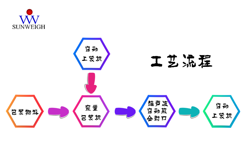 生產(chǎn)出的物料首先進(jìn)入緩存料倉(cāng)中,待包裝機(jī)開(kāi)始包裝時(shí),當(dāng)重量達(dá)到事先設(shè)定好的值時(shí),包裝機(jī)停止給料。自動(dòng)上袋機(jī)自動(dòng)拾取包裝袋,通過(guò)上袋機(jī)將包裝袋套在包裝機(jī)下料口處,包裝機(jī)檢測(cè)到包裝袋,螺旋開(kāi)始工作將物料送入包裝袋內(nèi),等到填袋完畢后,夾袋裝置松袋推袋裝置將裝滿物料的袋子推到輸送機(jī)上超聲波封口,最后再由輸送機(jī)將包裝好的物料包裝袋輸送到下個(gè)工序。